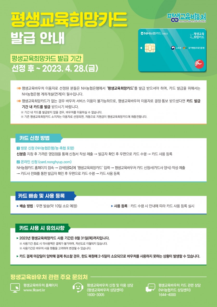 공지 2023년 평생교육바우처 선정자 카드 발급 및 사용 안내 23-05-12 14:29